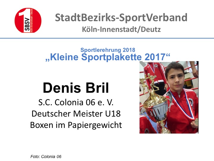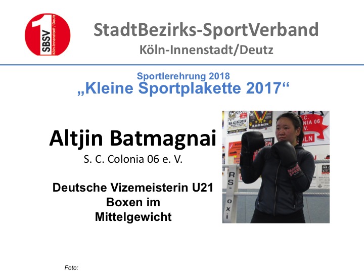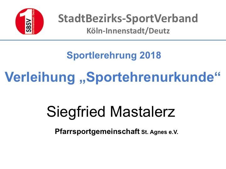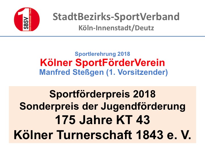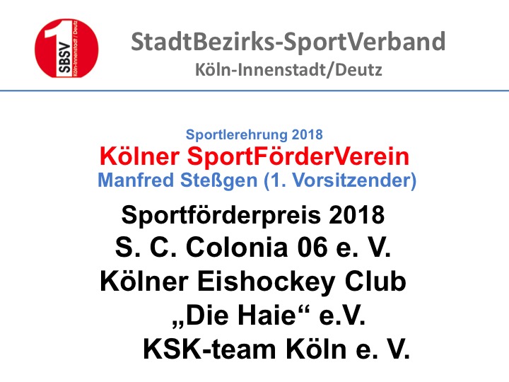Eine ausgefallene "Location" wählte der SBSV1 für die diesjährige Sportlerehrung des Stadtbezirkes Innenstadt, die Ehrung fand im „Kabarett-Theater Klüngelpütz“ in der Gertrudenstraße statt. Der SBSV1 unter der Leitung der Vorsitzenden Jana Kellermann kürte hier in dieser gemütlichen Atmosphäre die Preisträger. Ein Highlight neben den Ehrungen war der kurzweilige und humorvolle Exkurs: "Sport und Theater - sportlich-kabarettistisch" der charismatischen Theater-Chefin Marina Barth. Ihre wohlformulierten und kabarettistisch ausgefeilten Ausführungen lockerten die Veranstaltung so richtig auf, ein leckeres Buffet mit vielen Gesprächen beendeten diesen schönen Abend!